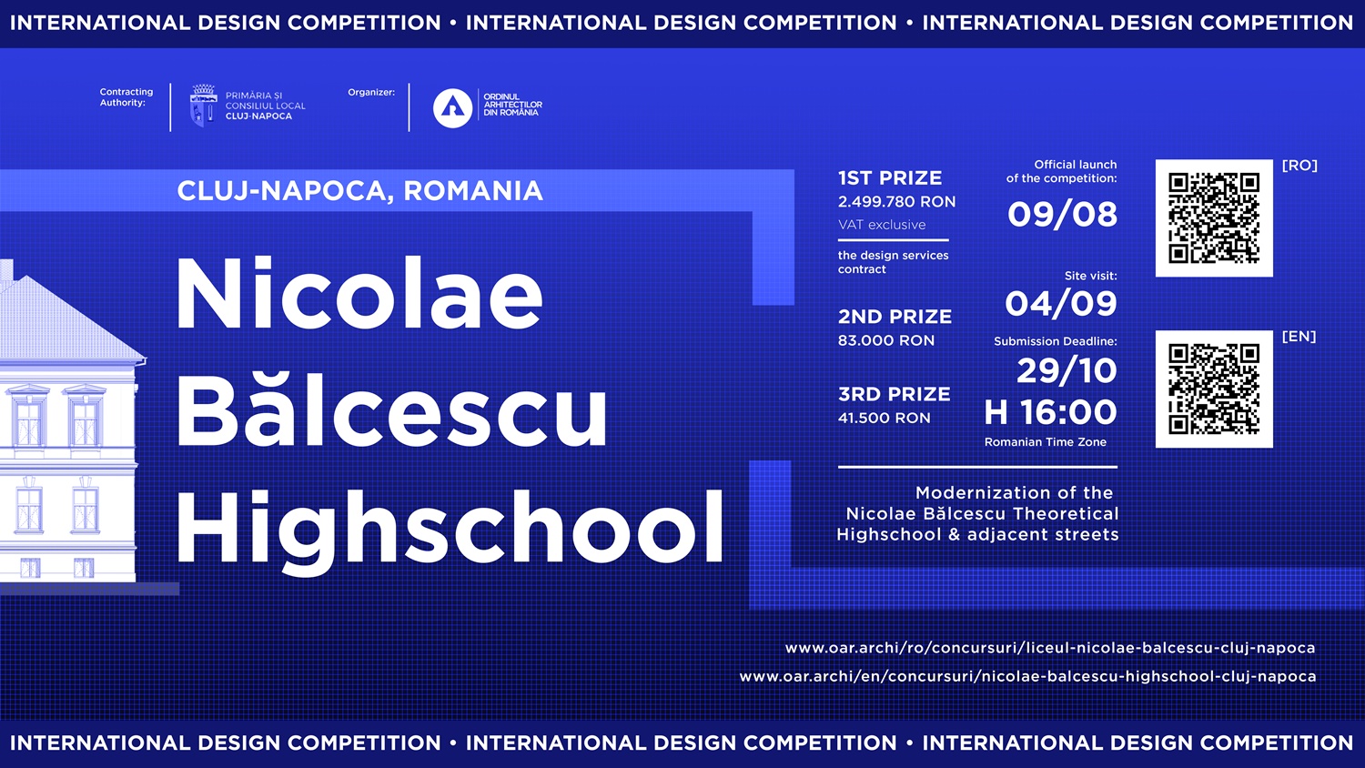 Ordinul Arhitecților din România și Primăria Municipiului Cluj-Napoca anunță oficial lansarea Concursului Internațional de Soluții ”Liceul Nicolae Bălcescu, Cluj-Napoca”.