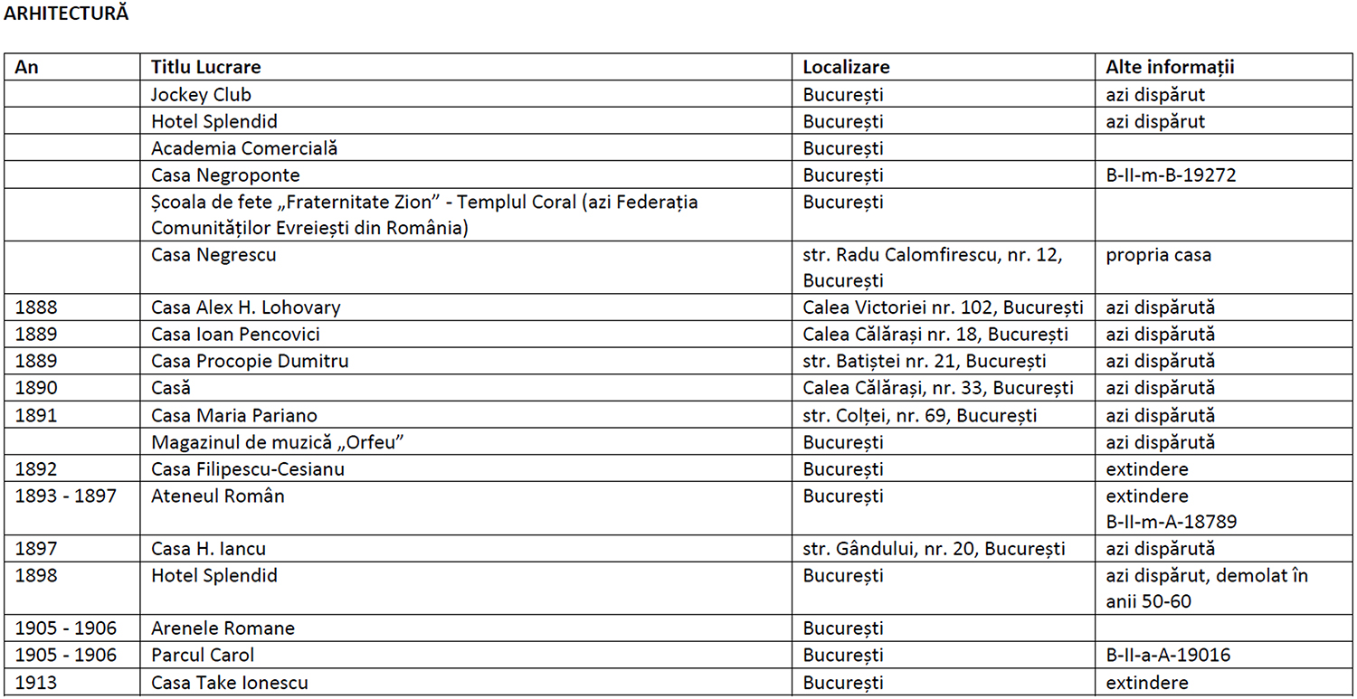 1888lucreaza in serviciu arhitecturii la Ministerul Cultelor si Instructiunii Publice